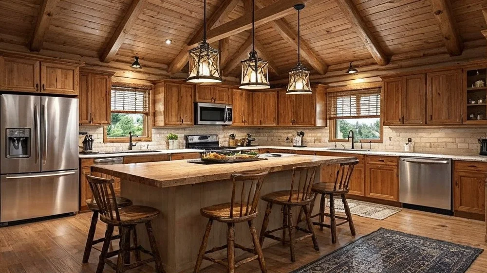 Experience the charm of a rustic log cabin kitchen with natural wood cabinets, exposed timber beams, and a spacious central island. This inviting space features modern stainless steel appliances blended seamlessly with classic farmhouse elements, making it perfect for family gatherings and entertaining in a cozy, woodland-inspired environment